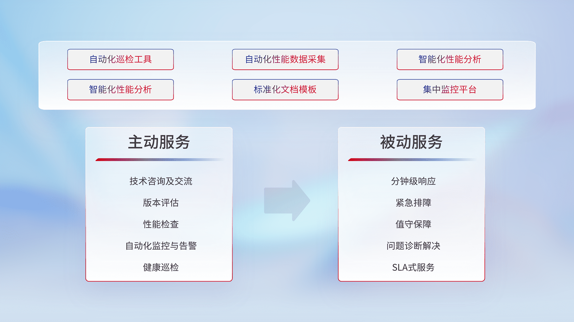 智能化工具和标准化文档,,,保障服务质量,,,提供主动服务(包含技术咨询、、版本评估、、性能检查、、、、自动化监控与告警、、、健康巡检)和被动服务包含(分钟级响应、、紧急排障、、、值守保障、、问题诊断解决、、、、SLA服务)。。。