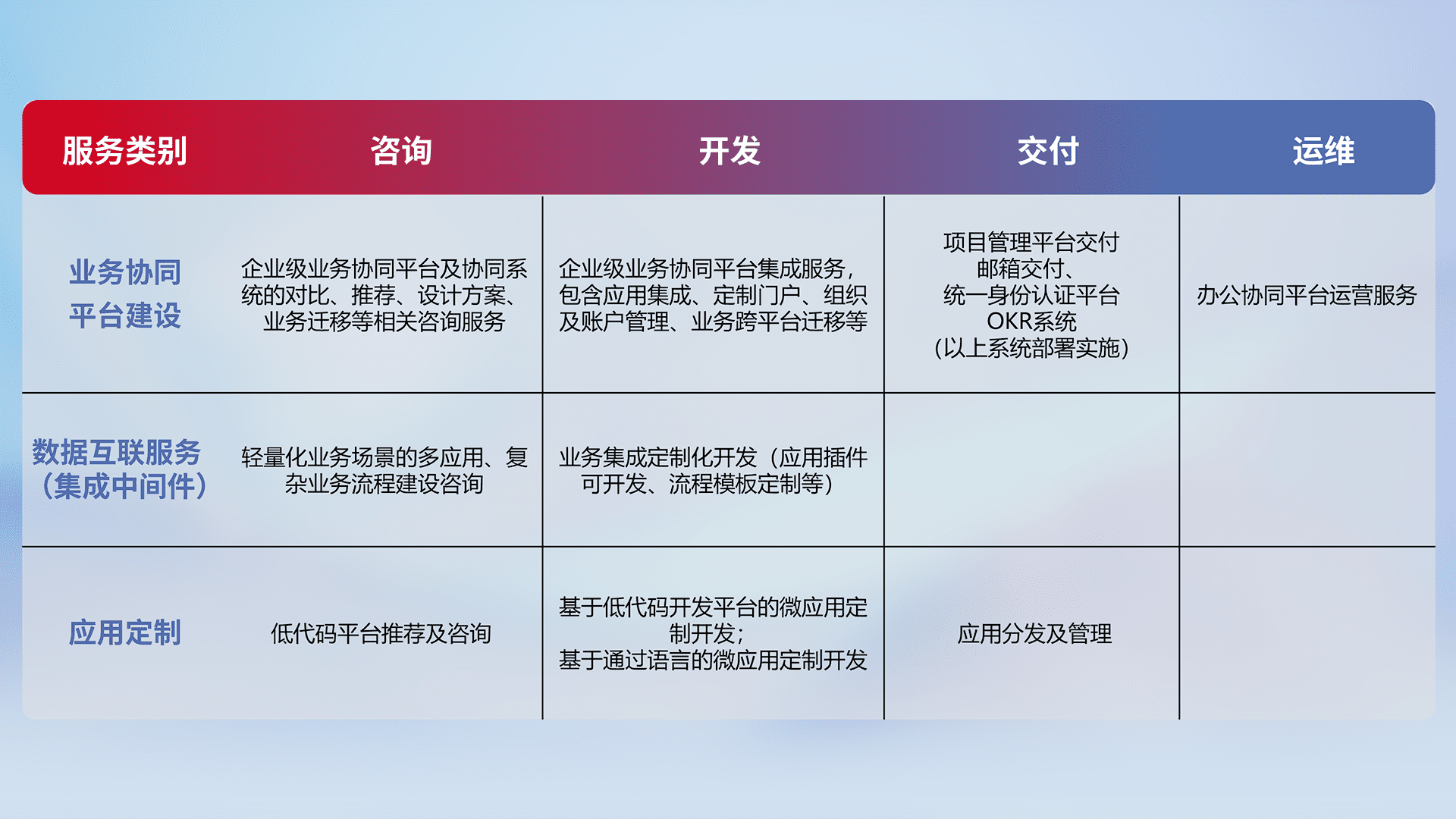 针对钉钉、、、、企微、、、、IDaas等平台级产品提供产品的规划、、、方案、、、、交付、、、、定制化开发等服务,,实现如统一协同办公、、、、智能客户服务、、、混合会议管理、、、、智能数据查询、、、等业务场景,,,,实现数字化转型。。。。